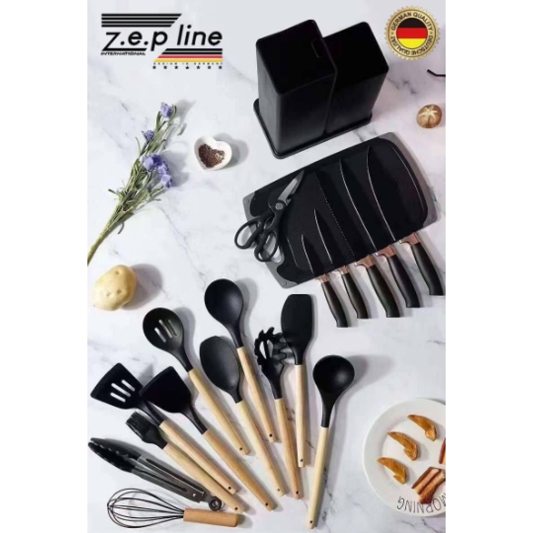Кухонный набор 19 в 1 предназначен для приготовления и обработки продуктов в домашних условиях. В комплект входят ножи, кухонные инструменты и разделочная доска, размещённые в компактной подставке для удобного хранения.