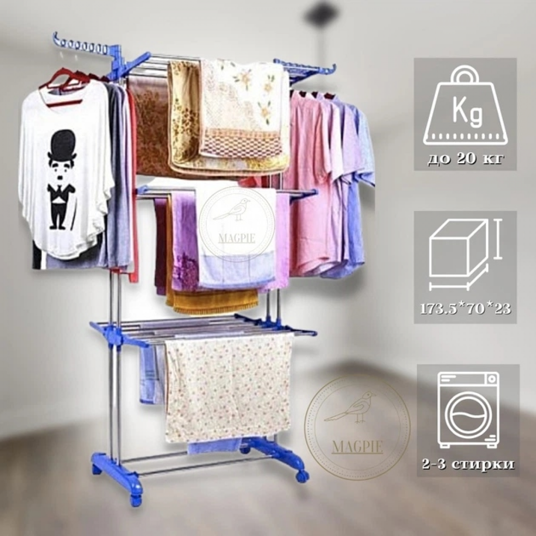 Вертикальная сушилка подходит для различных типов одежды и белья: футболок, рубашек, полотенец и других изделий. Благодаря устойчивой конструкции и нескольким уровням развески вещам обеспечивается максимальное пространство для сушки.