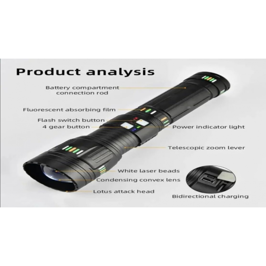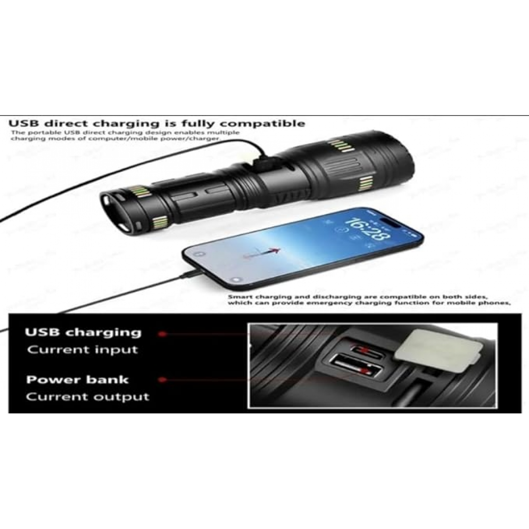 Фонарь работает от аккумулятора и заряжается через USB, что упрощает эксплуатацию без необходимости постоянной замены батареек. Компактный корпус обеспечивает удобство переноски и использования.
