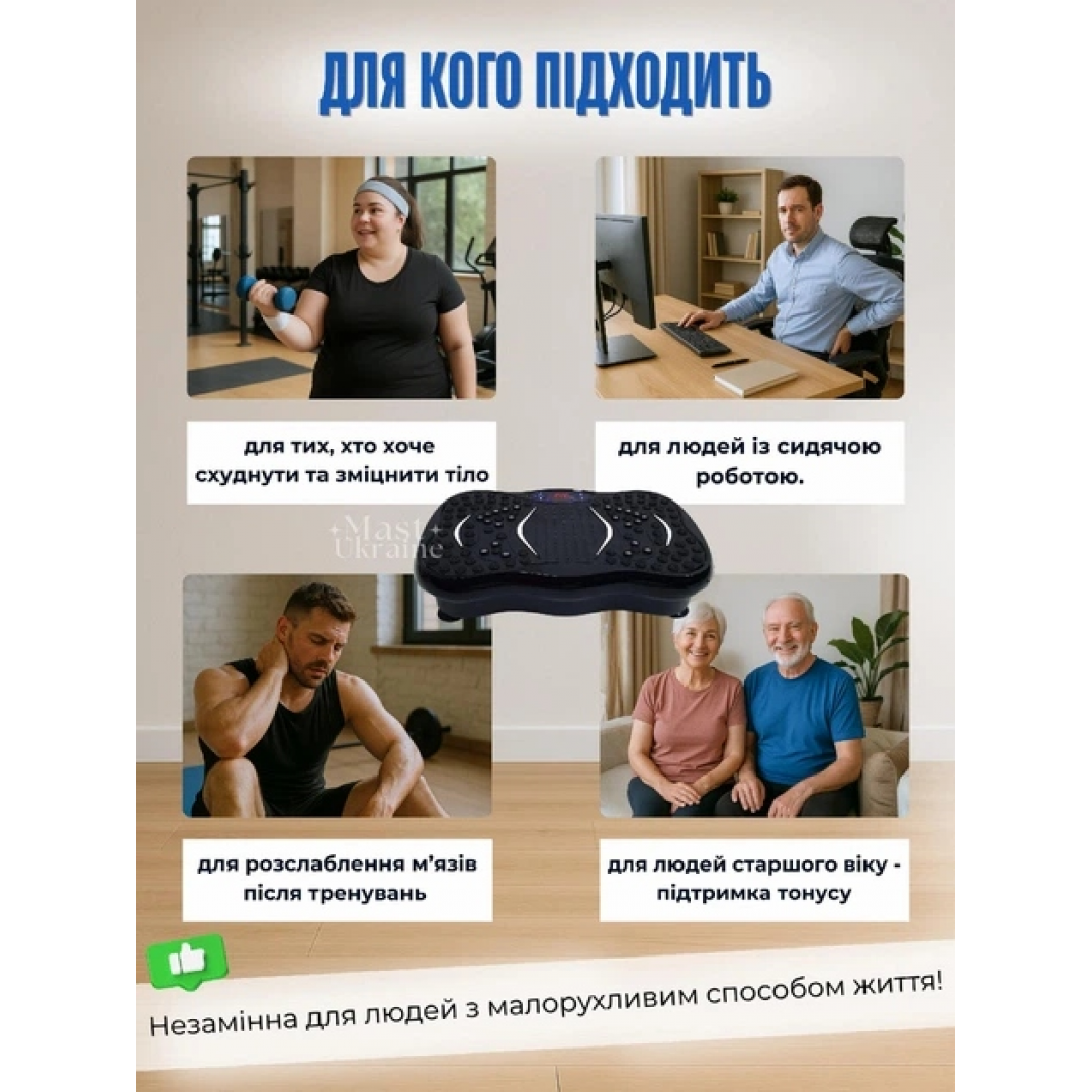 Предназначена для домашних тренировок и улучшения тонуса мышц за счёт вибрационной стимуляции. Может использоваться как дополнение к основной физической активности для повышения эффекта.