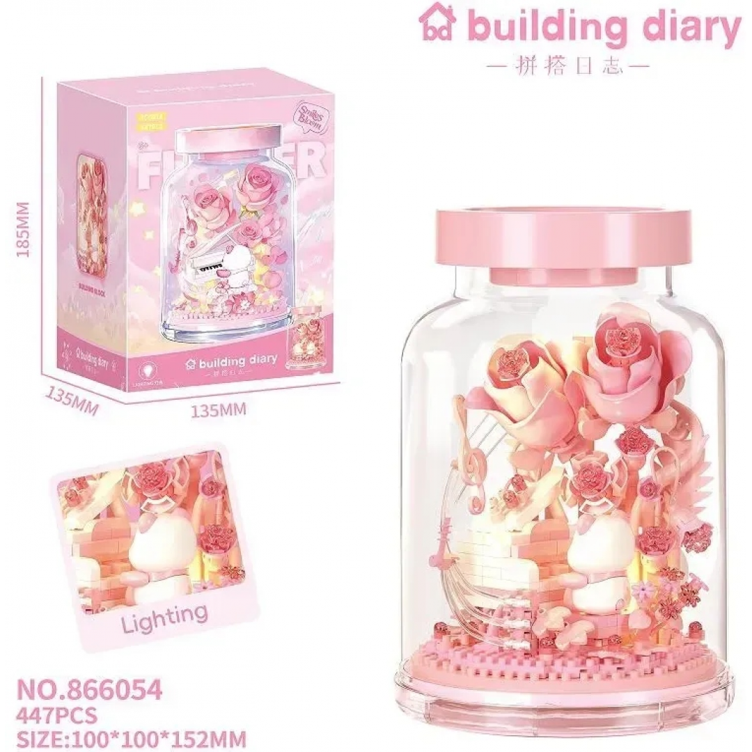 Конструктор «Розовые цветы и мишка за пианино», 866054, с подсветкой, 447 деталей