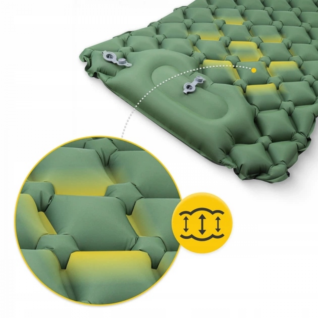 Модель оснащена встроенным подголовником и ячеистой конструкцией для равномерного распределения нагрузки. Легко надувается и складывается до компактного размера, что удобно для транспортировки.